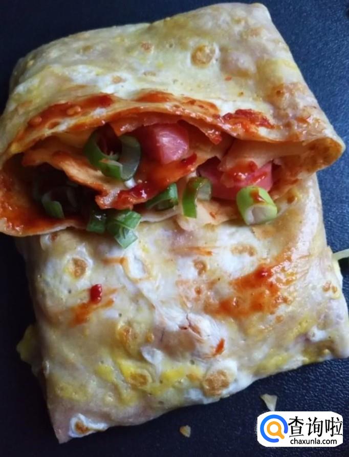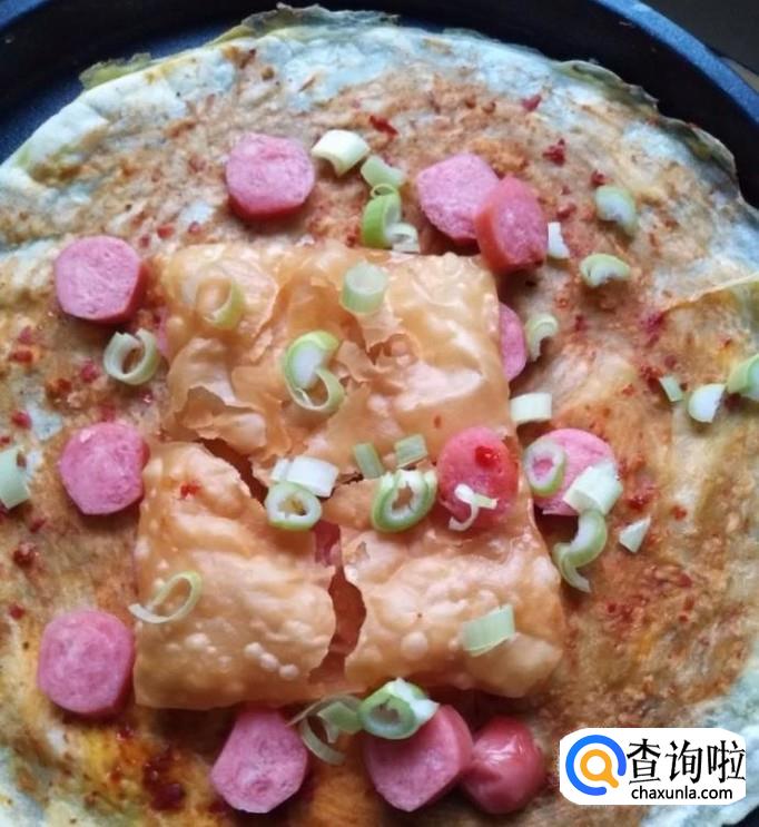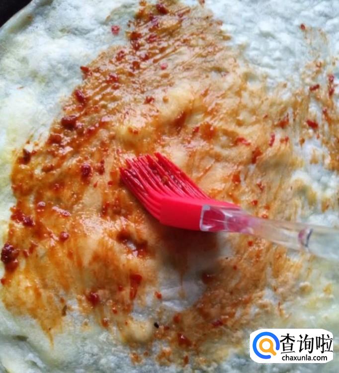 然后我们在饼上面刷一层蒜蓉辣酱,撒上葱花与火腿肠,放上炸好的面片,卷起来,美味的煎饼果子就制作完成啦!