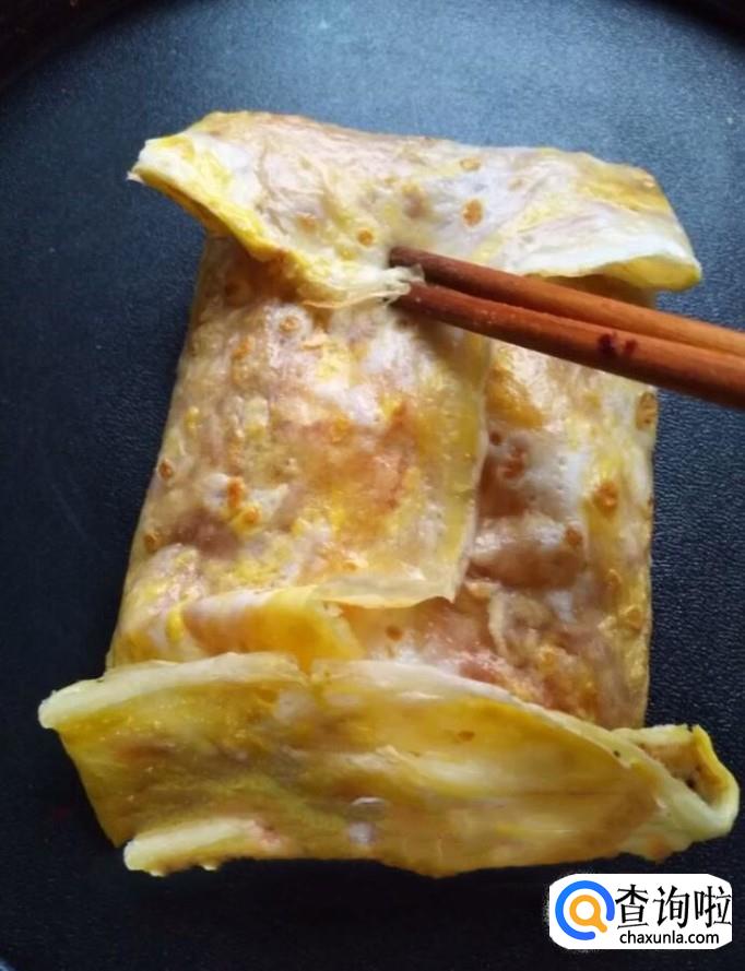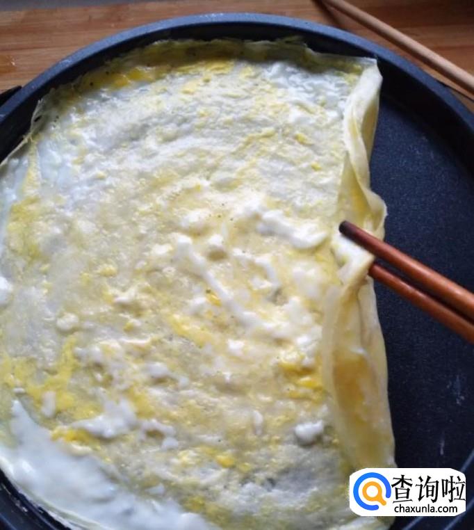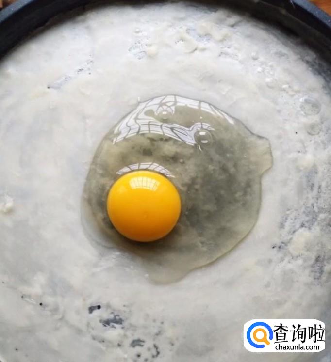 接着我们在电饼铛中倒入一勺面糊,用刮板摊平,打入一个鸡蛋,摊平,定型以后翻面