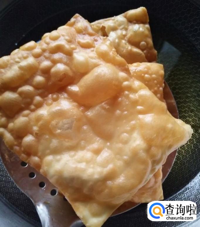 接着我们起锅烧油,油温六成热,下入面片,炸至金黄酥脆捞出控油