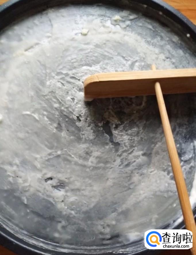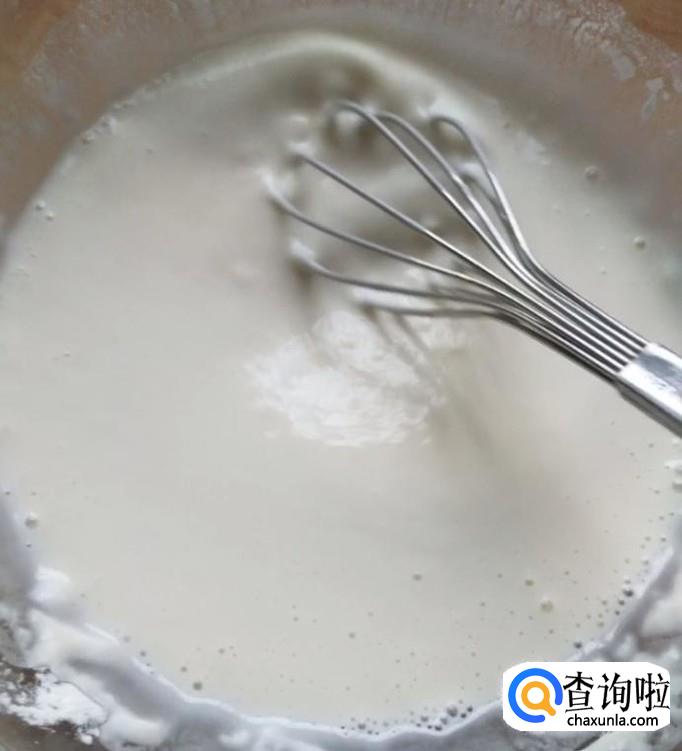 然后我们在一个碗中再次倒入面粉,加适量的清水,少许的盐,调成酸奶状的稀薄面糊