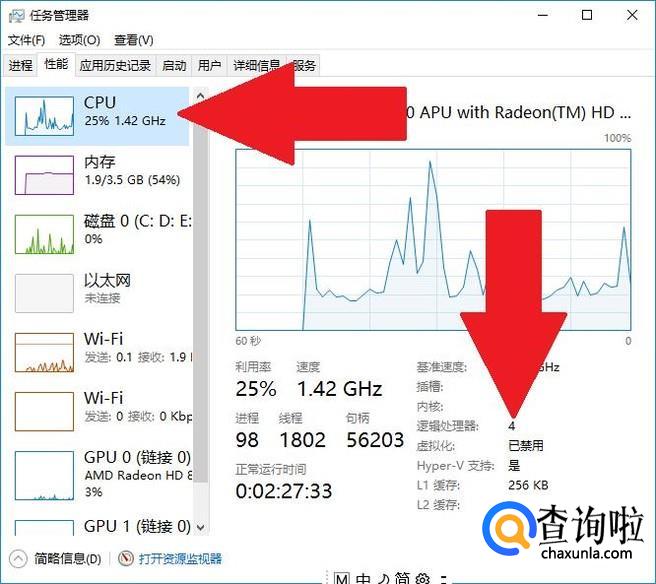 再点击进入“CPU”选项,如果CPU详情里的虚拟化显示为“已禁用”,则说明CPU关闭了虚拟化。如果显示“已启用”,说明CPU已经开启了虚拟化。