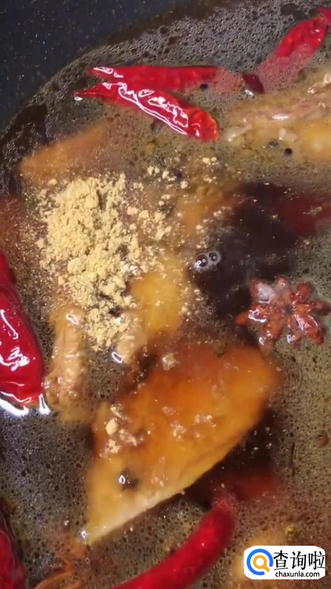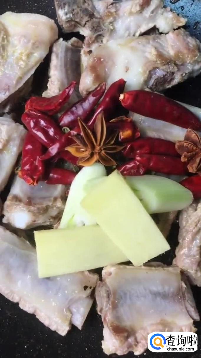 接着往锅中加入适量的生姜、大蒜、干辣椒和八角,如下图所示。