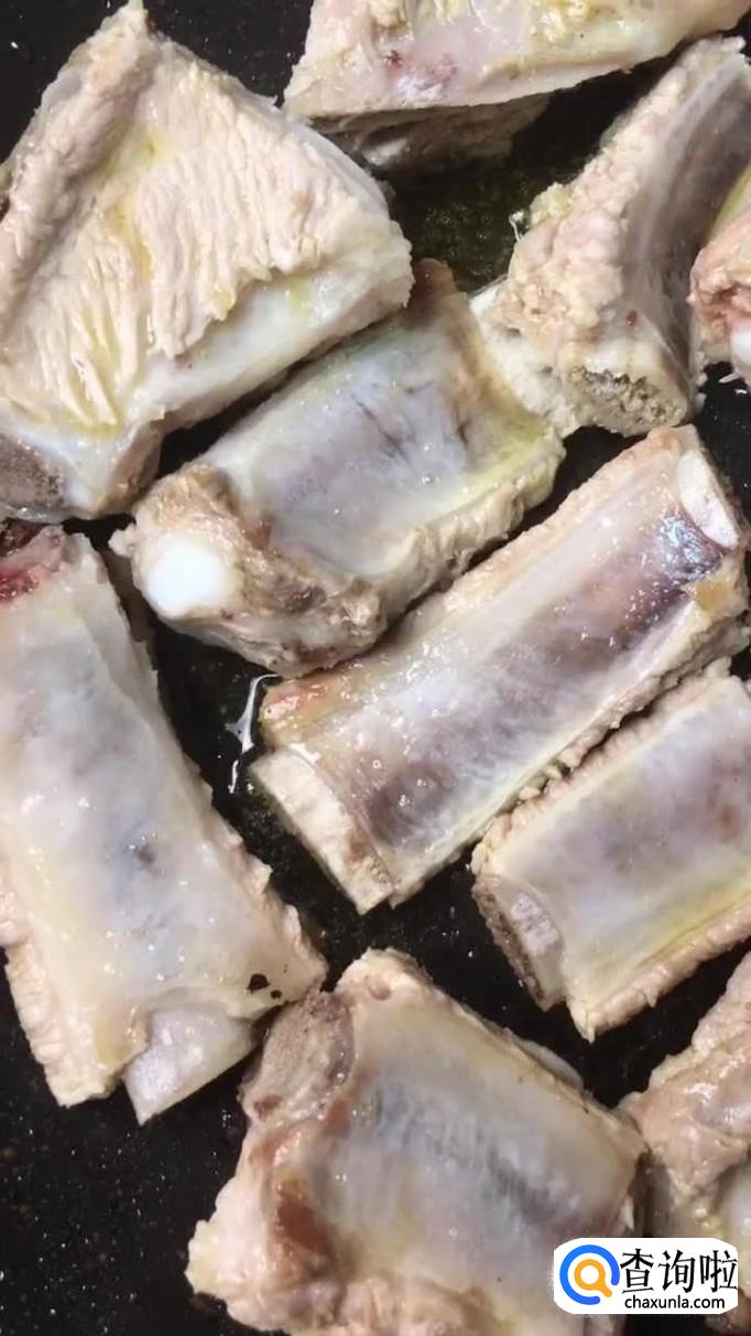 然后锅中放入适量的食用油,待油冒烟,倒入排骨翻炒两分钟,如下图所示。