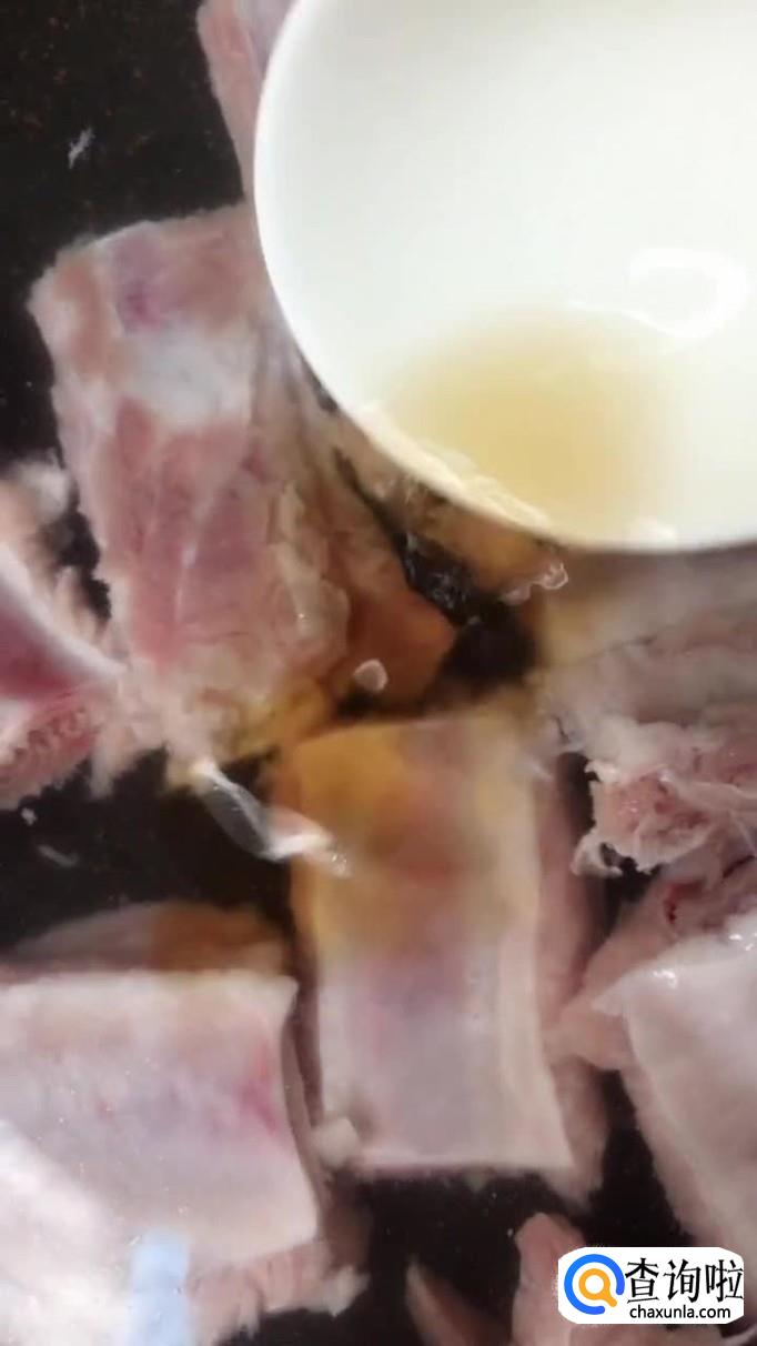 首先将买回来的排骨洗干净,倒入锅中,加入适量的清水和料酒煮五分钟,如下图所示。