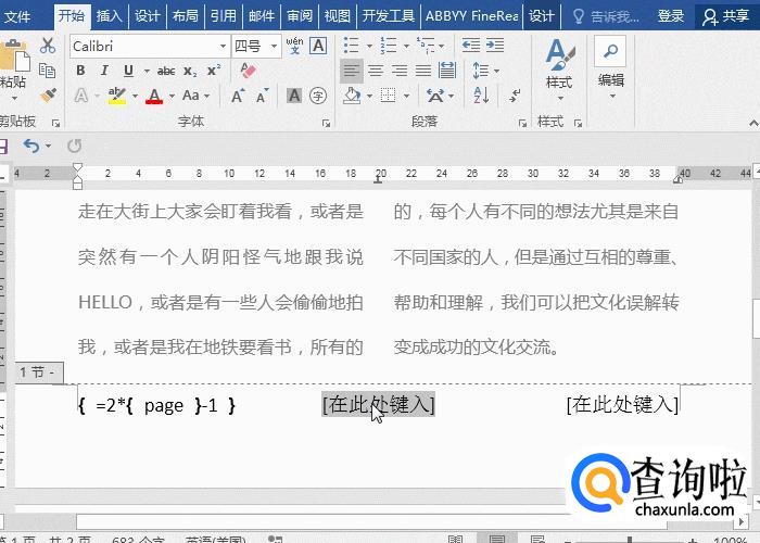 删除第一栏页码,使用快捷键【Ctrl+F9】快速的插入域,然后输入=2*{page}-1,注意{}都需要使用快捷键【Ctrl+F9】插入哦。