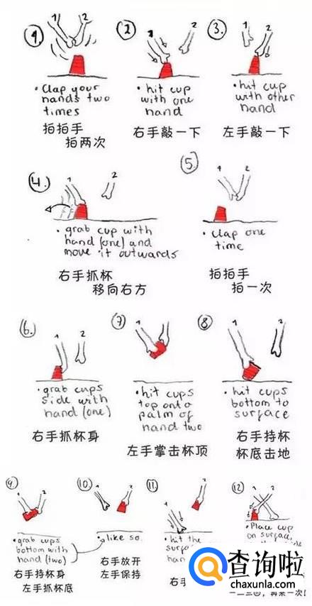 如果你觉得自己已经练习准备充分,不如亲自上手试一下一个简易的杯子舞来增强信心吧.接下来就是 拍拍手,拍两次 右手敲一下 左手敲一下 右手抓杯,移向右方 拍拍手,拍一次 右手抓杯身 左手击掌杯顶 右手持杯,杯底击地 右手持杯身,