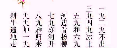一九二九不出手。三九四九冰上走。五九六九沿河看柳。七九河开,八九燕来。九九加一九,犁牛遍地走。一九二九三九等等是数九歌的内容,人们从冬至开始划分,每九天一个阶段,当九九八十一天后,就是大地回春的时候了。