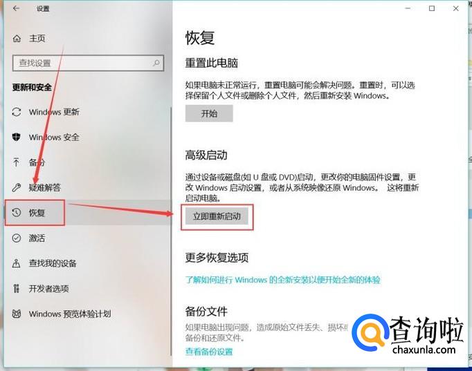 进入到更新和安全设置中,点选左侧的恢复,在右侧界面找到立即重新启动按钮。