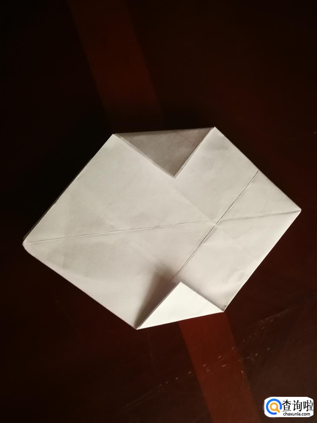 把底端折不平的三角形捏着角向内缩,形成一个小正方形。再把上面的相邻两条边也向里折叠一小段。