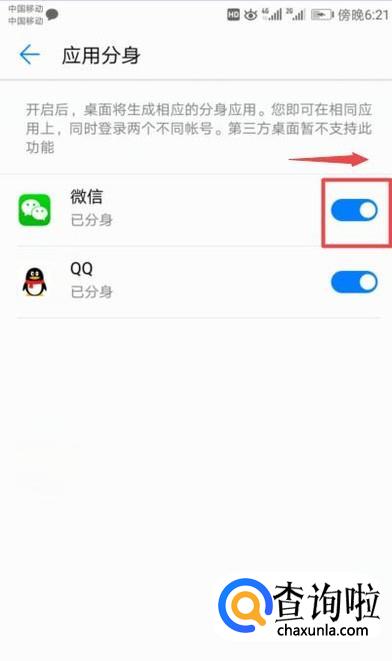 之后我们将微信的开关向右滑动打开,如图所示,这样就快速的开启了微信分身了。