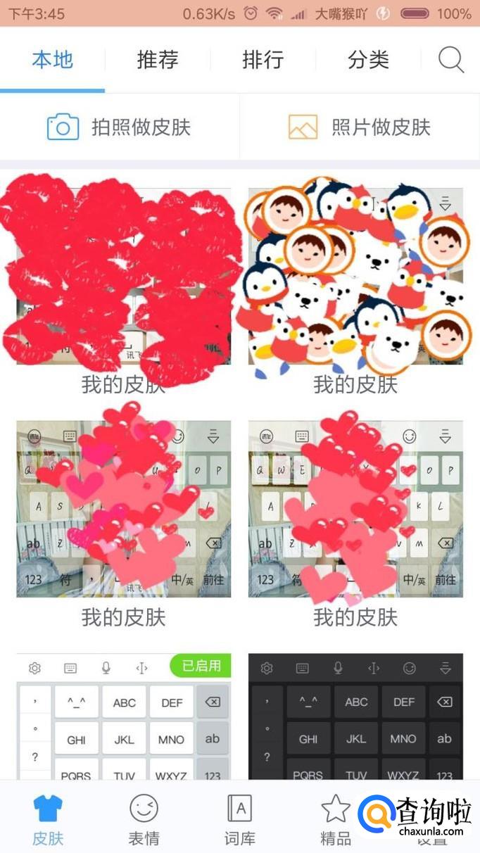 挑选皮肤。有各种各样的皮肤,这些皮肤是以画或者是明星的画像作为背景的,如此之多总有一种是你喜欢的,点击你喜欢的皮肤并且将其下载下来,点击使用,你可以看到皮肤上面有个已启用标志。还可以用自己拍摄或者自己相册的图片。