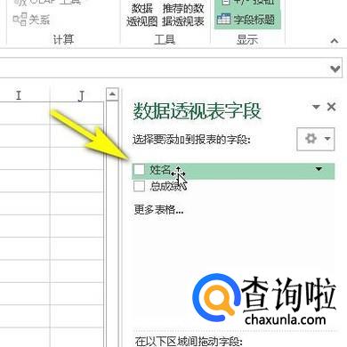 在工作表的右侧这里即时显示出“数据透视表字段”窗口。把鼠标放在“姓名”这里,鼠标呈四向箭头状,