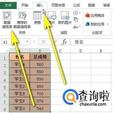 接着,鼠标移到菜单栏这里,点击:插入;在下面展开的内容中再点:数据透视表