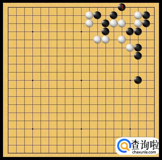 黑棋先行,黑棋左面被白棋阻挡。于是,黑棋在黑1处小尖,黑1位于黑棋底线,黑棋是想通过黑1这手棋连接右上角黑棋。如图所示。