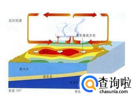 出现在秘鲁、厄瓜多尔一带,可能造成海水异常变暖,鱼类大量死亡。成因:由于南半球赤道附近的东南信风减弱后,造成太平洋地区的冷水上泛,导致大范围海水温度增暖,使赤道洋流和大气环流异常,从而造成太平洋沿岸地区降水异常,一边洪涝灾害,另一边则是干旱严重。