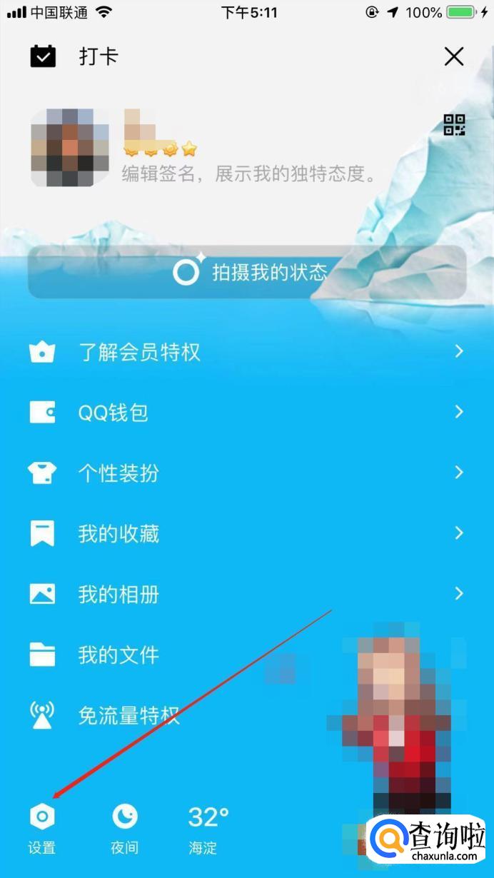 然后,进入头像界面后点击左下角的“设置”。