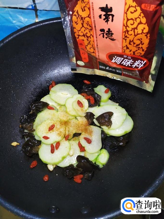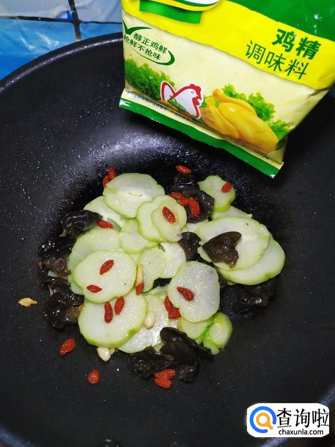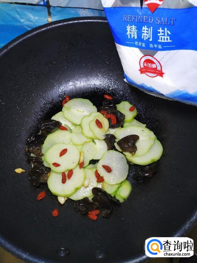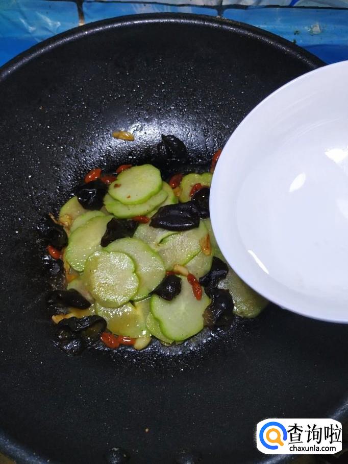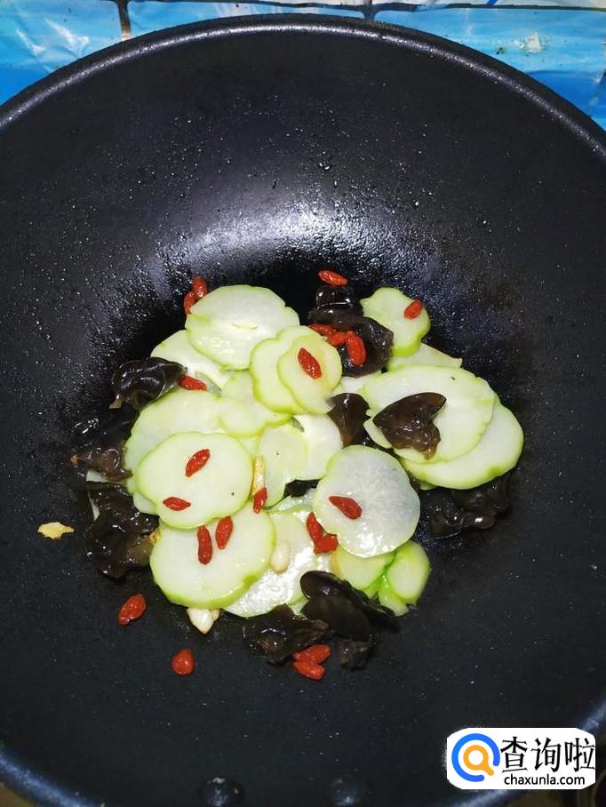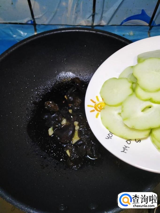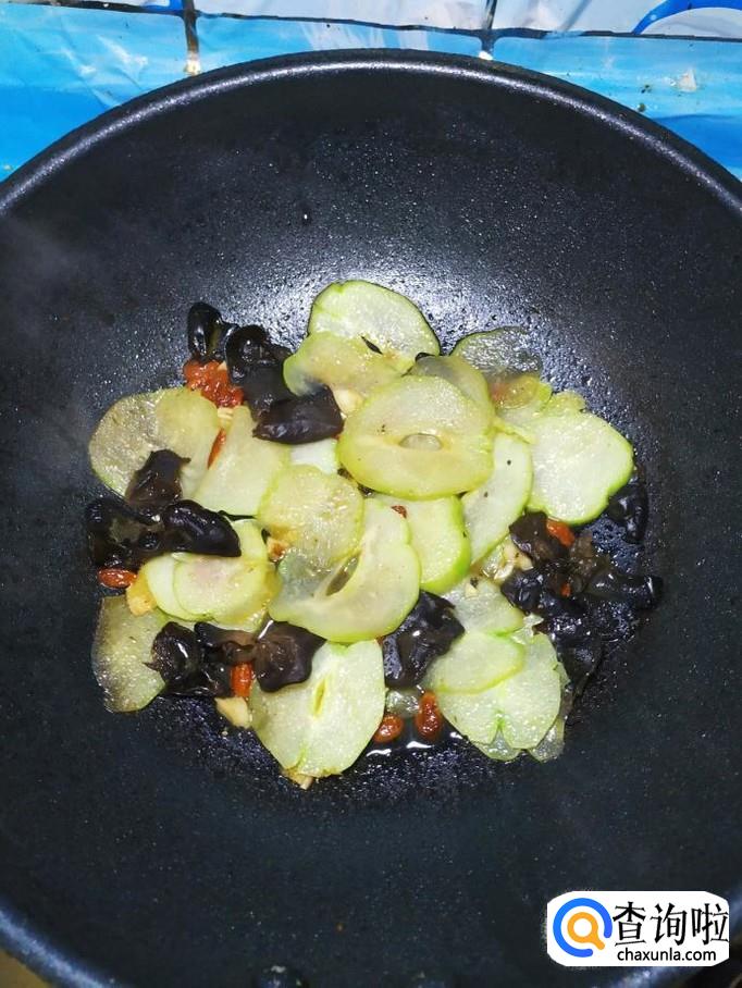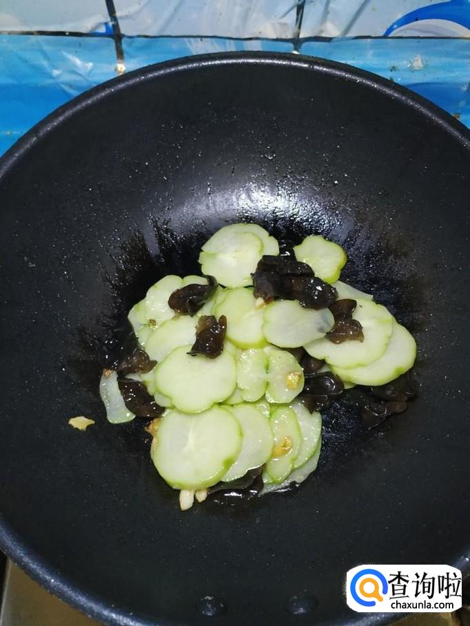 为防止木耳溅出来,迅速将准备好的佛手瓜片倒入锅中,和木耳一起翻炒均匀。