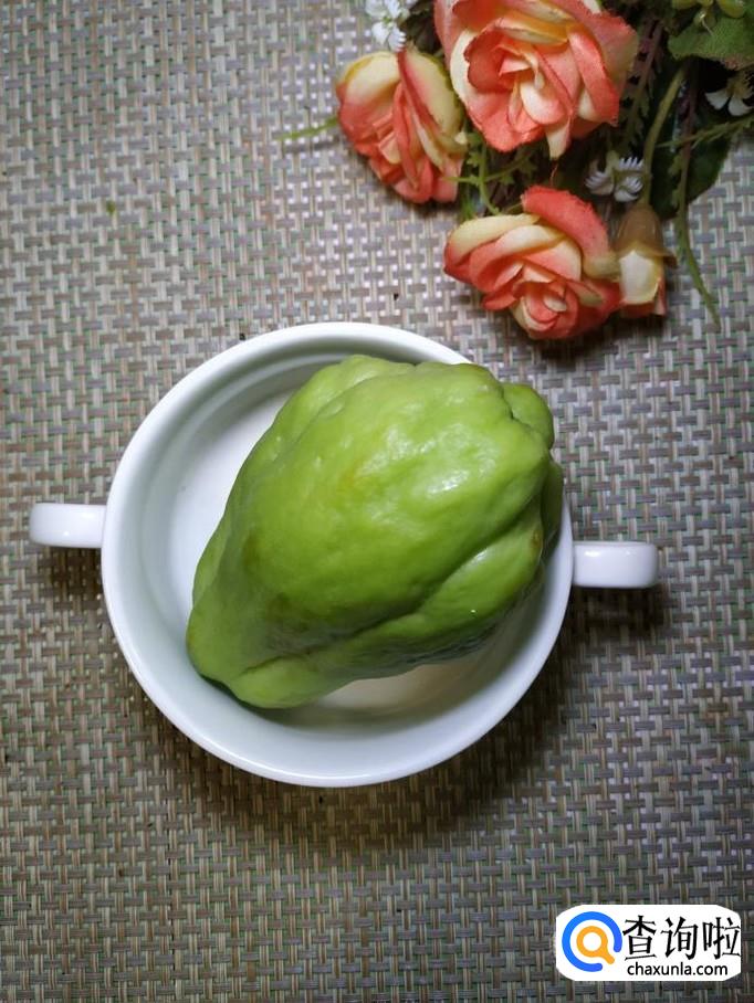 准备一个佛手瓜,用清水洗净后,去除外皮,切成薄片,放入盘中备用,佛手瓜的内瓤特别少,可以切片后再去掉。