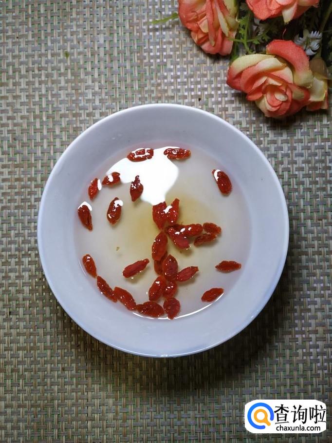 再准备适量木耳和枸杞子,用清水泡发,将泡发后的木耳,用手撕成小朵备用。