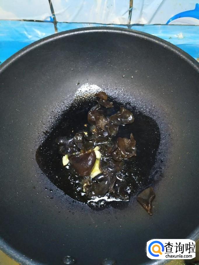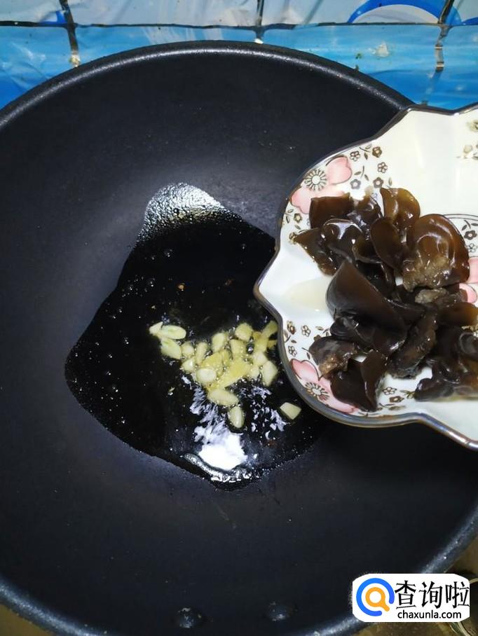 准备适量蒜,洗净后,切成片备用,炒锅中放入适量油,油热后将蒜片放入锅中炒香,然后将准备好的木耳倒入锅中,爆炒一下。