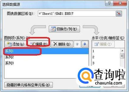 如图所示,选中“系列1”以后,点击“编辑”,然后在出现的选项框中输入“系列名称”,点击确定即可。