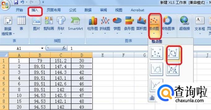 首先,我们生成散点图,如图所示,选中表格后,点击“插入”,“散点图”,然后选择一种图形格式,初步的图形就形成了。