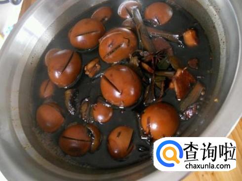把去掉皮的鸡蛋放入炒好的糖色锅里,把鸡蛋裹上糖色,再加入适量水、然后加入2勺老抽,大料、桂皮、香叶,盐,等调料,小火煮上30分钟,让调料味渗入到鸡蛋里。
