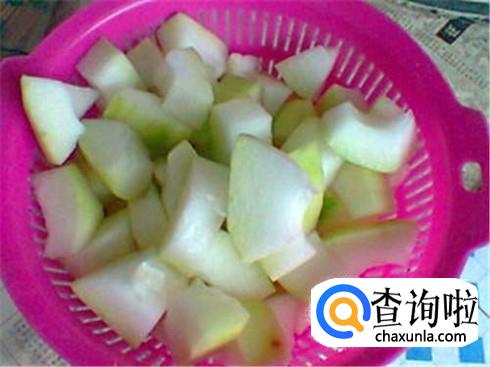 冬瓜去皮,切成滚刀块。喜欢吃宽粉的在温开水里泡上一把宽粉,喜欢吃粉条的泡上一把粉条。