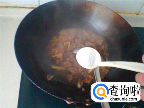 锅里倒一点食用油,烧热之后放上肉,慢慢的炒,让肉里的油脂都炒出来,肉变得有些许硬的时候,加上一勺子生抽和葱姜快速翻炒,然后加上半碗水。