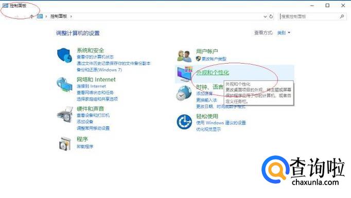 唤出"控制面板"程序窗口,点击"外观和个性化"项。