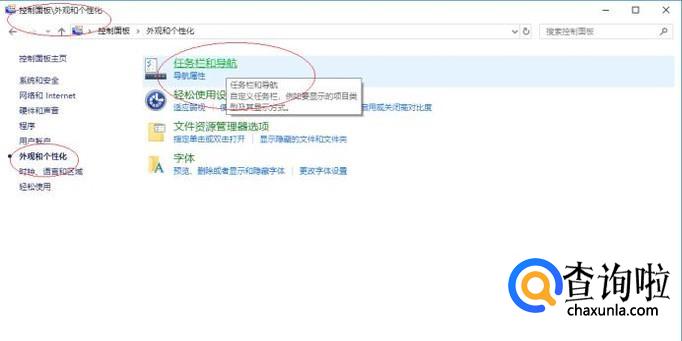 唤出"外观和个性化"选项界面,点击右侧"任务栏和导航"项。