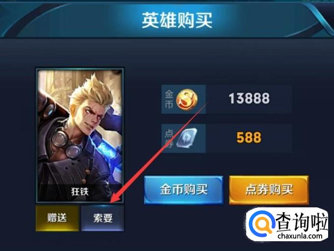 进入之后,向好友发起索要即可,等待着好友赠送该英雄即可免费获得。