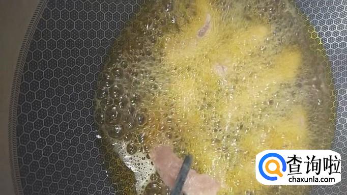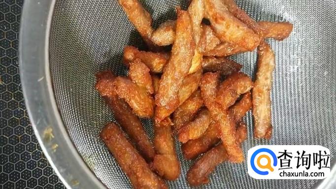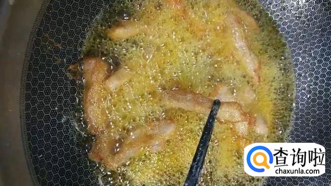 在锅中加入豆油,加热至油温五成热时,将腌制好的肉条放入油中炸制。