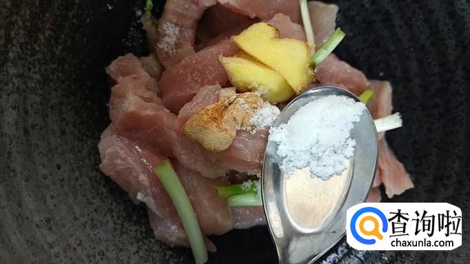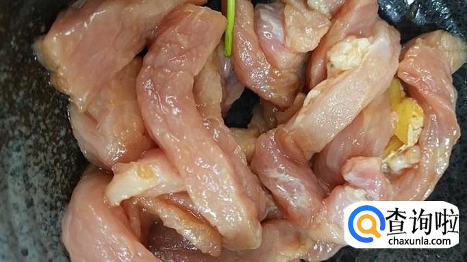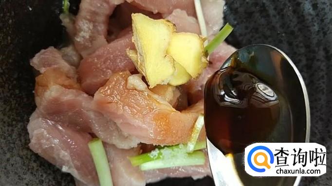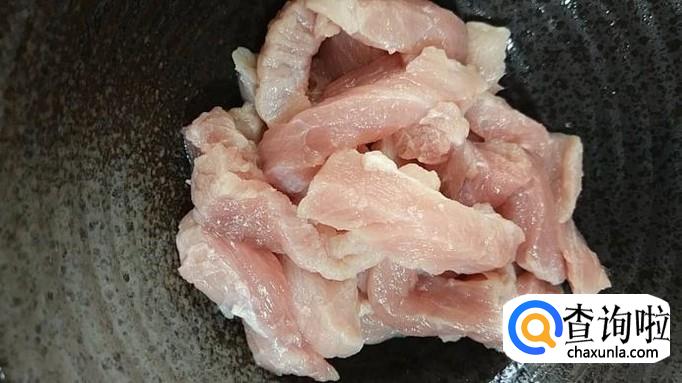 取500g猪里脊肉,切成2cm宽、5cm长的条状,放入碗中。