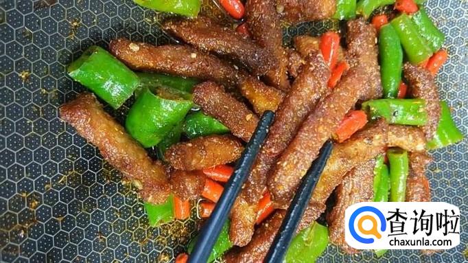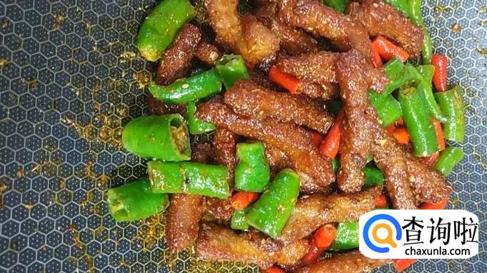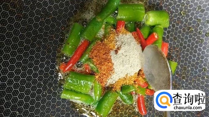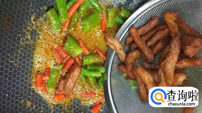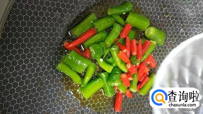 在锅中留少许油,加热至油温八成热时,将准备好的青、红辣椒段放入锅中,煸炒至表面微黄。