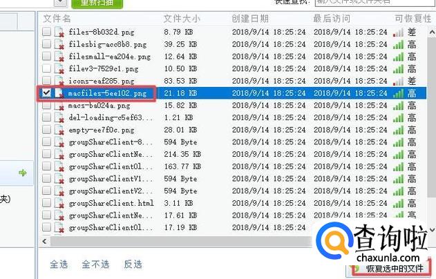 扫描完成后,我们选中我们想要恢复的数据文件,然后我们点击恢复选中的文件就可以了。