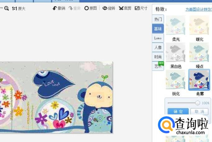 点击右侧基础特效中的去雾功能,然后点击确定,画面上的雾就被去掉一些了。