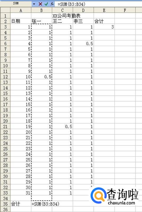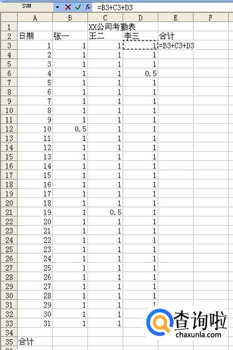 在张一最下面的合计栏中也输入求和公式,这个合计是每个人31天总共出勤天数。