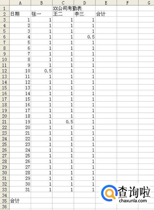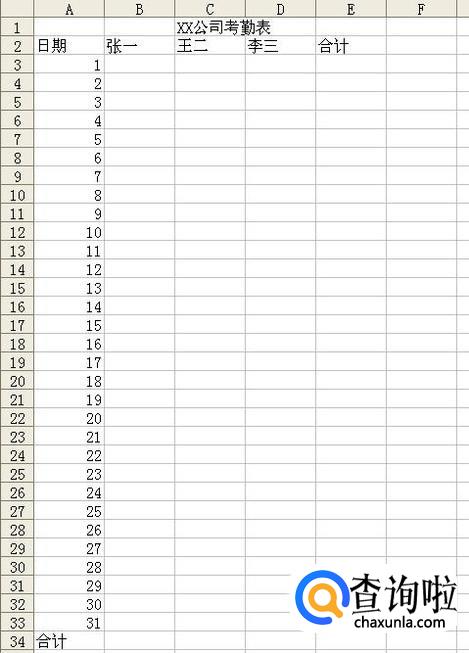 在日期的右面,每一列写上一个人的名字,假设公司有三个人,在名字最右侧写上合计,这个合计是每天所有人的出勤总数,在31下面再写一个合计,这个合计是每个人每月的出勤情况。