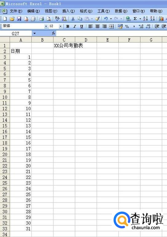 在第一列第二行输入日期,因为每个月最多31天,所以日期写到31。