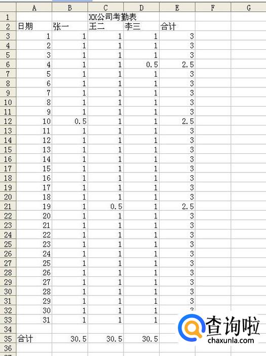 用1或0.5来表示每天的出勤情况,1表示全天出勤,0.5表示出勤半天。根据实际情况,把每个人的出勤情况填写好。