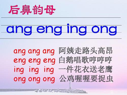 后鼻韵母共有4个:ang、eng、ing、ong。它们都以舌根浊鼻音-ng作为韵尾。