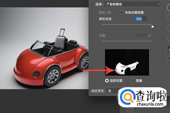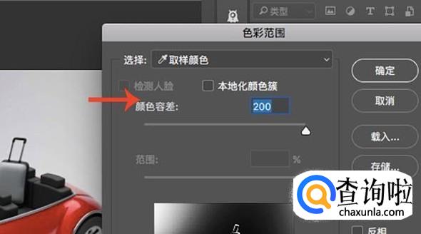 在色彩范围弹框中,将颜色容差的范围调高一点。