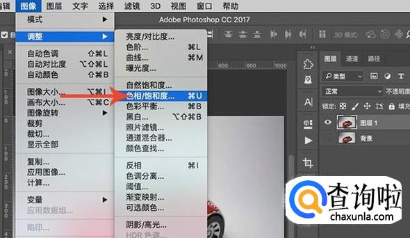 接着在上方菜单中选择“图像-调整-色相/饱和度”
