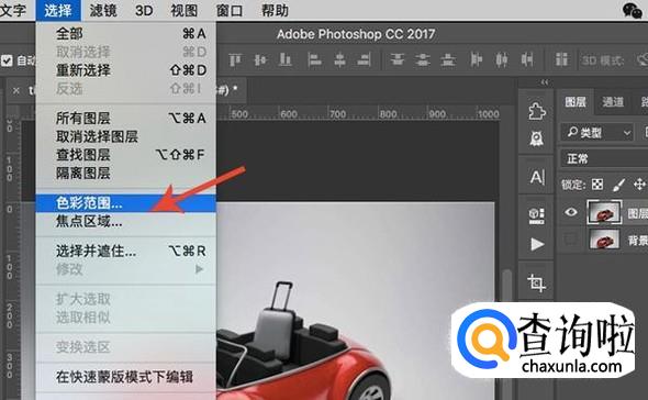 接着点选图层1,在上方菜单中选择“选择-色彩范围”