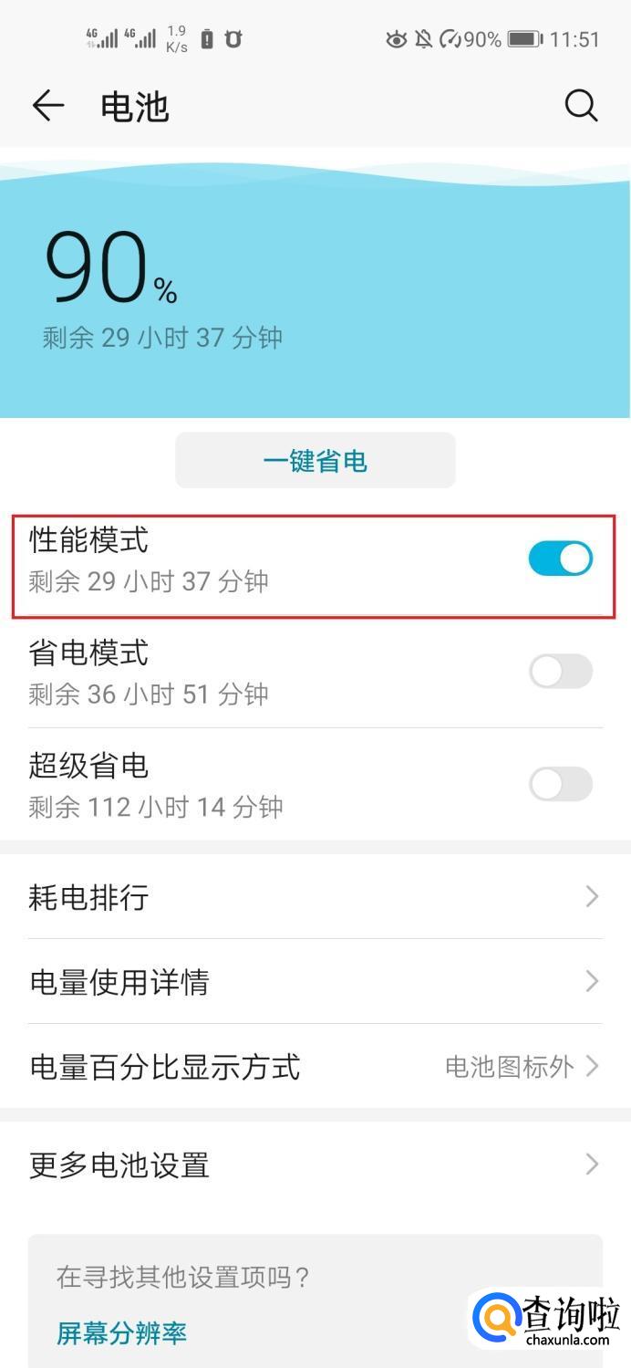 打开电池界面后,就可以看到性能模式选项,右边按钮蓝色代表处于打开状态。