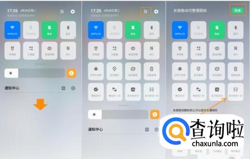 方法二:下拉状态栏,如果没有屏幕录制,先点击屏幕右上角配置图标左边的图标,在下方找到开始录屏图标,长按拖动到上方区域。