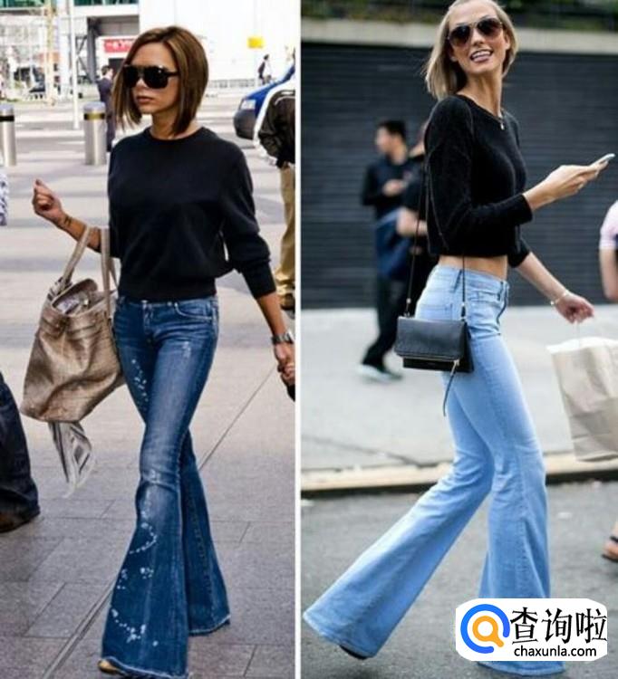 除了阔腿裤还可以选择近期非常流行的喇叭裤,膝盖开始宽松的喇叭裤也能修饰腿型。