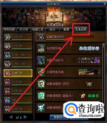 进入称号簿界面后,在上方的分类列表中,点击进入“无法达成”一栏。