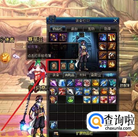 在装备栏中,点击三本“书”中的第一本,打开“称号簿”。